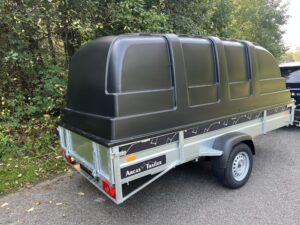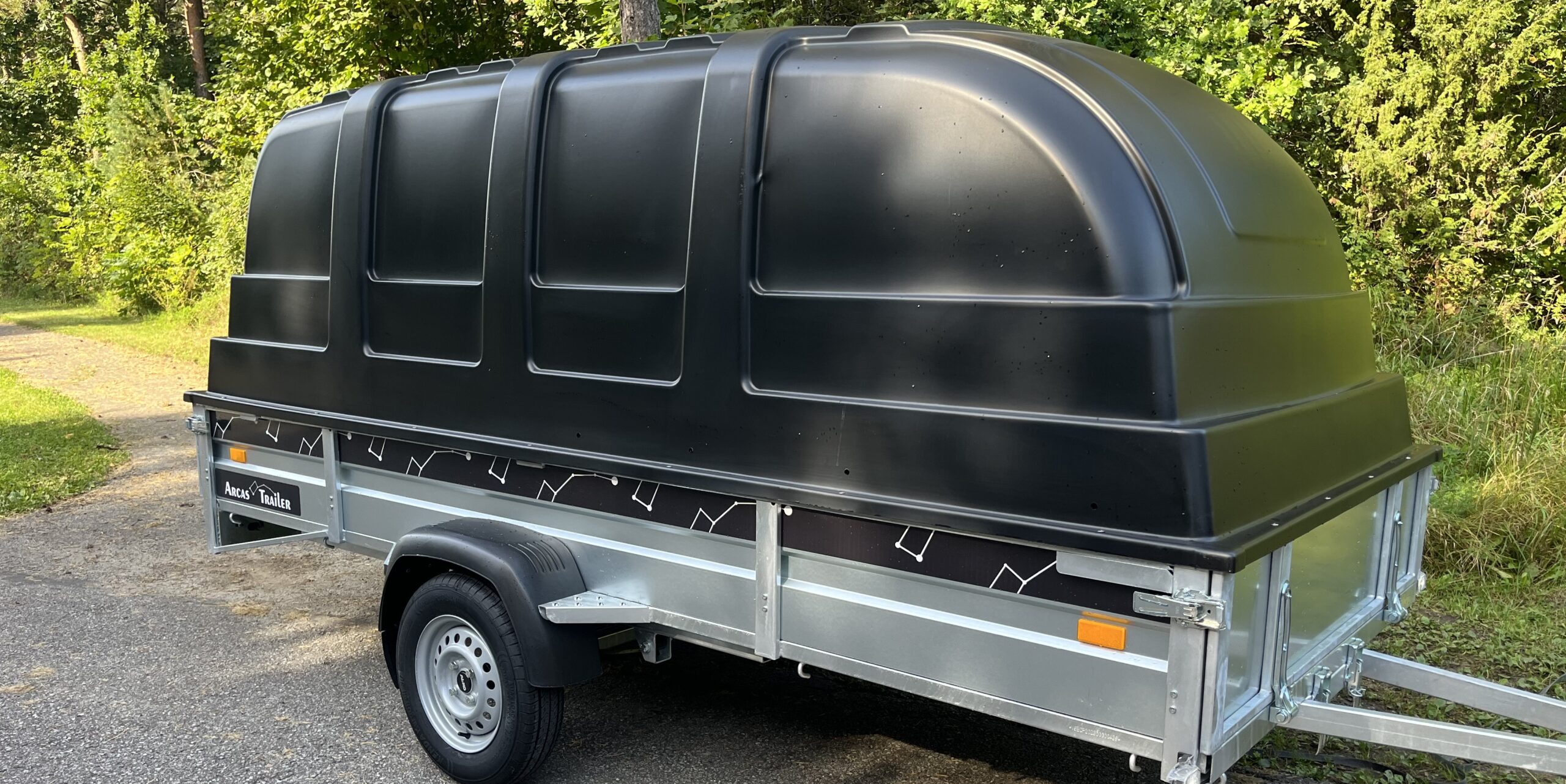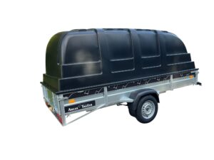 Üheteljeline, keevitatud ja kuumtsingitud täisraamiga haagis, komplekteerituna koos plastkaanega. Veokasti mõõdud 350×150 cm